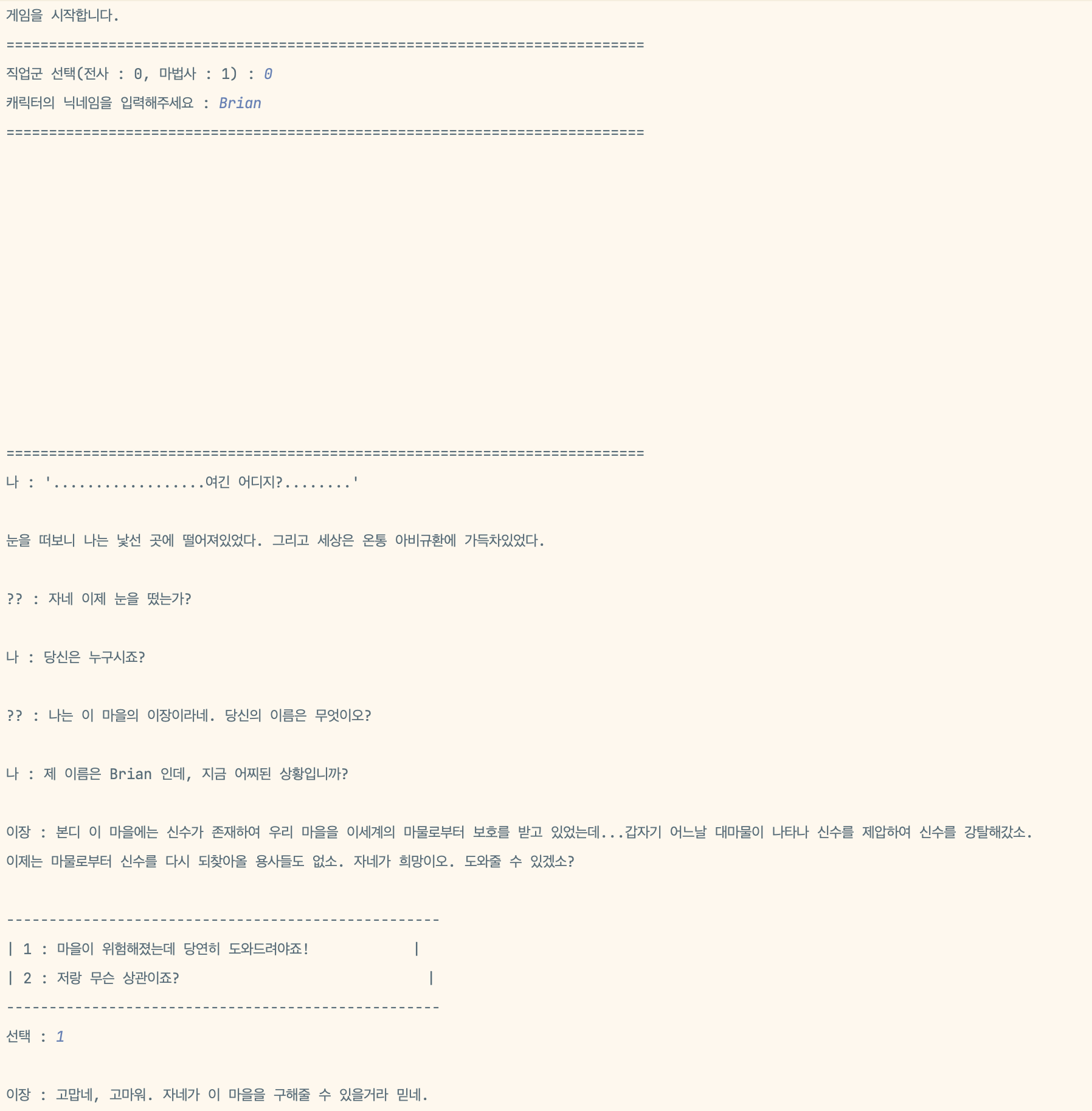 스프링을 배우기 전에 자바 배운 것들을 정리하는 김에 자바만을 이용해서 텍스트게임을 만들어보았습니다. 디자인 패턴이나 설계를 고려하지 않았기 때문에 다소 프로젝트가 스파게티입니다.